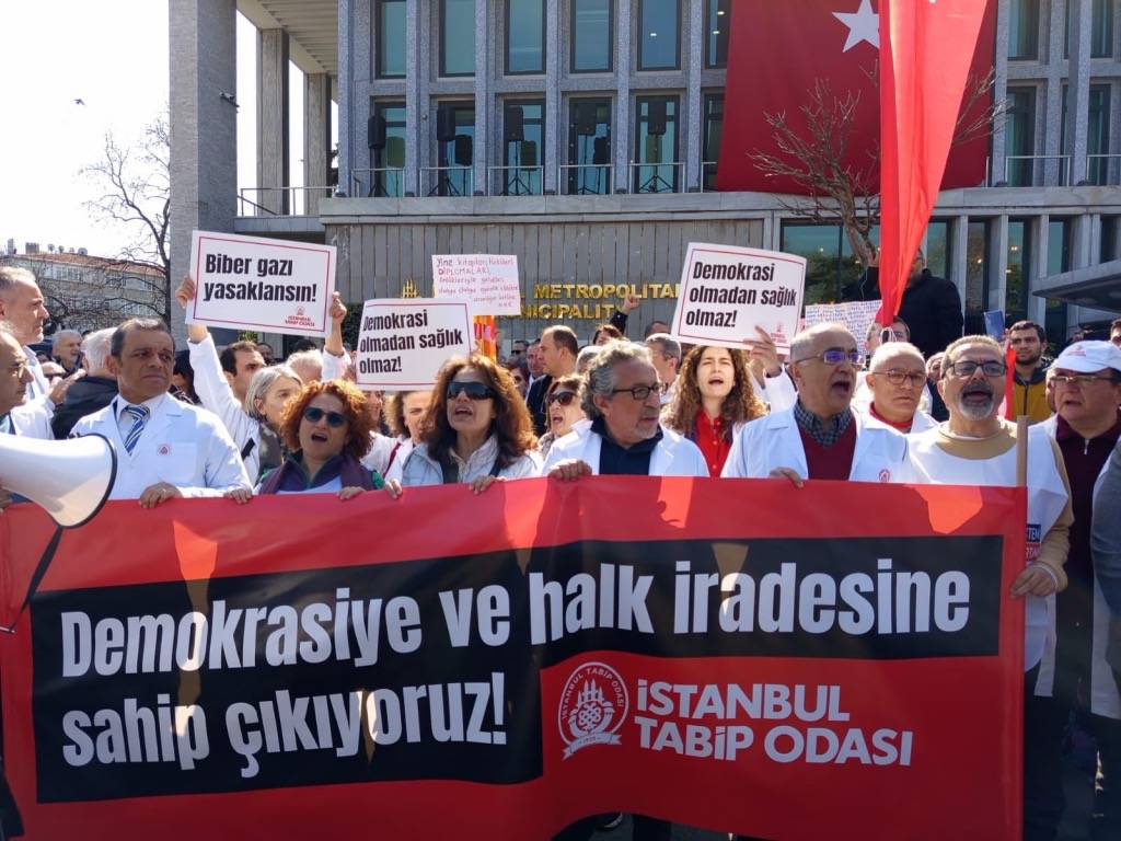 Türk Tabipleri Birliği (TTB) ve İstanbul Tabip Odası’nın (İTO) çağrısıyla yüzlerce hekim, Cumhuriyet Halk Partisi’nin (CHP) Cumhurbaşkanlığı ön seçim adayı ve İstanbul Büyükşehir Belediye (İBB) Başkanı Ekrem İmamoğlu’nun gözaltına alınması üzerine Saraçhane’ye beyaz önlükleriyle bir yürüyüş düzenledi.